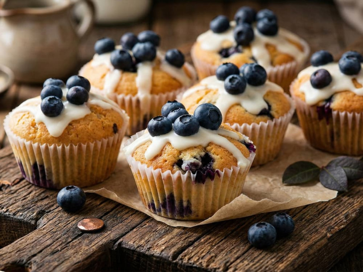 3. Zdobenie a podávanie: Čučoriedkové muffiny nechajte vychladnúť. Polevu roztopte podľa návodu a ozdobte muffiny. Na vrch dajte čučoriedky.