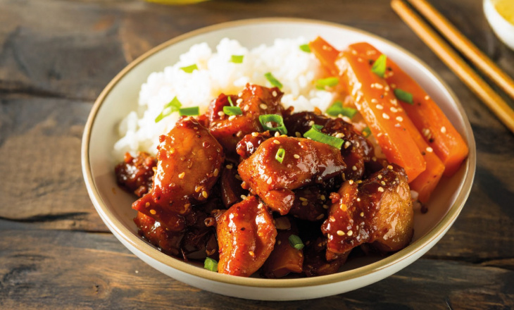 Hotové bravčové kúsky podávame s mrkvou a ryžou, posypané jarnou cibuľkou a sezamom.