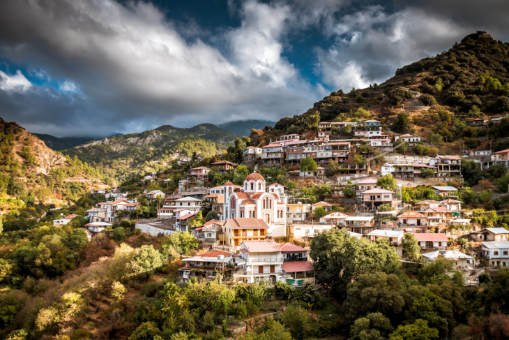 Ak sme spomínali rušné letoviská pri mori – tak len pár kilometrov odtiaľ je úplne iný svet. Cyperský vidiek je naozaj idylický, optimálne miesto, ak chcete stráviť aktívnu dovolenku, ale užívať si pritom pokoj. Okolie niektorých dediniek, napríklad Tochni, vyzerá ako Toskánsko. Tu sa dá bývať v starých kamenných domoch, ale zároveň si užívať vymoženosti ako bazén pred dverami, či wifi pripojenie. Byť „účastní“ bežného života Cyperčanov, ale zároveň to nemať ďaleko k moru. Či na požičanom aute, alebo, keď ste zdatnejší, na bicykli. Tochni je centrom pre cykloturistov, je tu naozaj dobre vybavená požičovňa kvalitných bikov, od cestných až po e–biky a robia tu aj cyklistické výlety so sprievodcom. Turisti môžu odtiaľto chodiť aj na rybačky na more s rybármi, zúčastniť sa na vinobraní alebo zbere olív či citrusov, vyrábať tradičný syr halloumi. Agroturizmus dorazil aj sem, a to vo veľmi atraktívnej podobe.Jedna z najkrajších dedín je Omodos. Je tu napríklad najstarší lis na hrozno na Cypre, kamenné domy, úzke uličky, príjemné námestie s tavernami, kde poskytuje tieň vínna réva. V miestnej pekárni môžete ochutnať, ako chutí chlieb s cícerom, sú tu obchodíky s vínom, ale aj s umeleckými a remeselníckymi výrobkami, doteraz tu maľujú ikony. Pred domami sedia babky a háčkujú ihlou omodské čipky, aj keď už sú už viac turistická atrakcia ony samy ako ich výrobky. Vo vnútrozemí je možná aj klasická horská turistika a v zime sa dá dokonca aj lyžovať. V pohorí Troodos sú vybudované turistické chodníky, na jednej krátkej túričke sme aj boli. Aj keď sme mali trochu obavu, či to nebude len „lapák“ na turistov, nakoniec sme boli príjemne prekvapení. Chodník popri potoku k menšiemu vodopádu bol podobný ako lesné chodníky v našich horách.