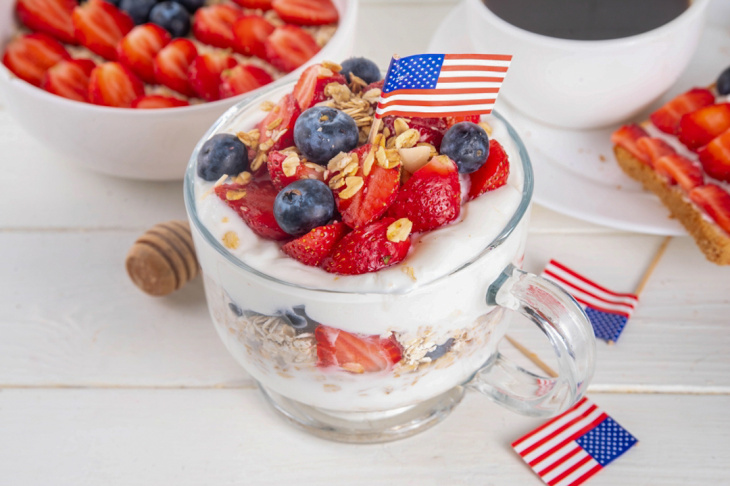 Americké parfait: vrstvený dezert v pohári, ktorý pozostáva z jogurtu, granoly, ovocia a šľahačky. Parfait sa hodí na raňajky, brunch, alebo ako zdravší dezert. Americké parfait je výborné aj pre deti – ovocie, jogurt a trochu chrumkania.