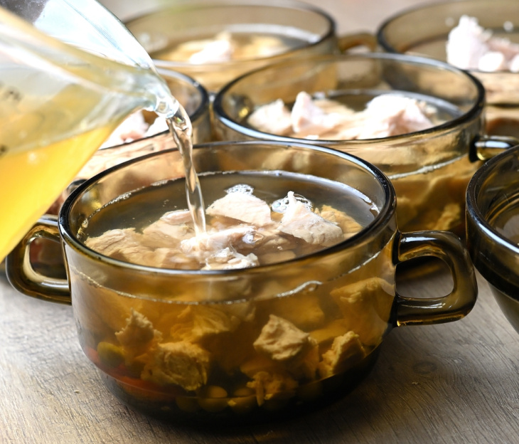 Urobte si tanierovú skúšku. Odoberte za lyžicu vývaru na malý tanierik a dajte ho na 5 minút do chladničky. Ak po vybratí povrch pruží a nelepí sa na prst, máte hotovo.Následne mäso oberte od kostí, rozdeľte do misiek, pridajte pár koliesok uvarenej zeleniny a zalejte vývarom. Podávajte s čerstvou cibuľou, octom a chlebom.