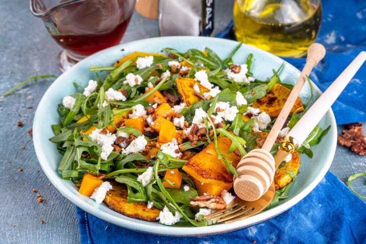 Šalát z pečenej tekvice a fetyTekvica hokkaido alebo maslová tekvica po upečení krásne zosladne. Kocky tekvice upečte s olivovým olejom a rozmarínom. Ešte teplé ich zmiešajte s čerstvým šalátom poľníčkom alebo s rukolou, pridajte rozdrobený syr feta a nasucho opražené tekvicové semienka. Ako dresing sa skvelo hodí medovo-horčicová zálievka.