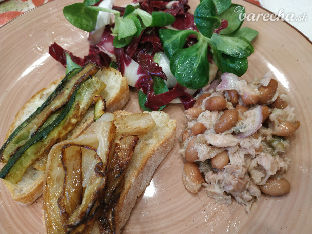 Celý deň som robila zásobu raviol do mrazáku...no a teraz na večeru len takto - tuniakovy šalát s fazulkou,cibulkou, kapelami a tuniakovy zaliaty citrónom k tomu trochu listov a grilovaná zelenina