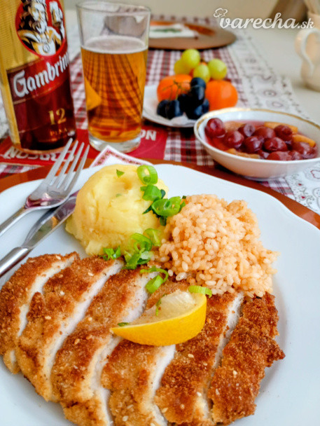 Rezeň (šak nedeľa🙂), 1/2 pučene zemiaky, 1/2 paprikova ryža, domáci miešaný kompót a zaslúžený pohár piva