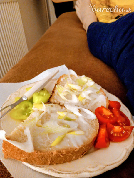 Chlieb s domácou masťou (u nás: "šmaľec") a cibuľou, čaj 😋