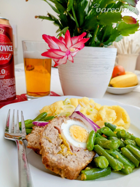 Pečená sekana so syrom a vajcom, dusené zemiaky s maslom, fazuľové lusky s čilli vločkami...a pohár piva 🙂😋