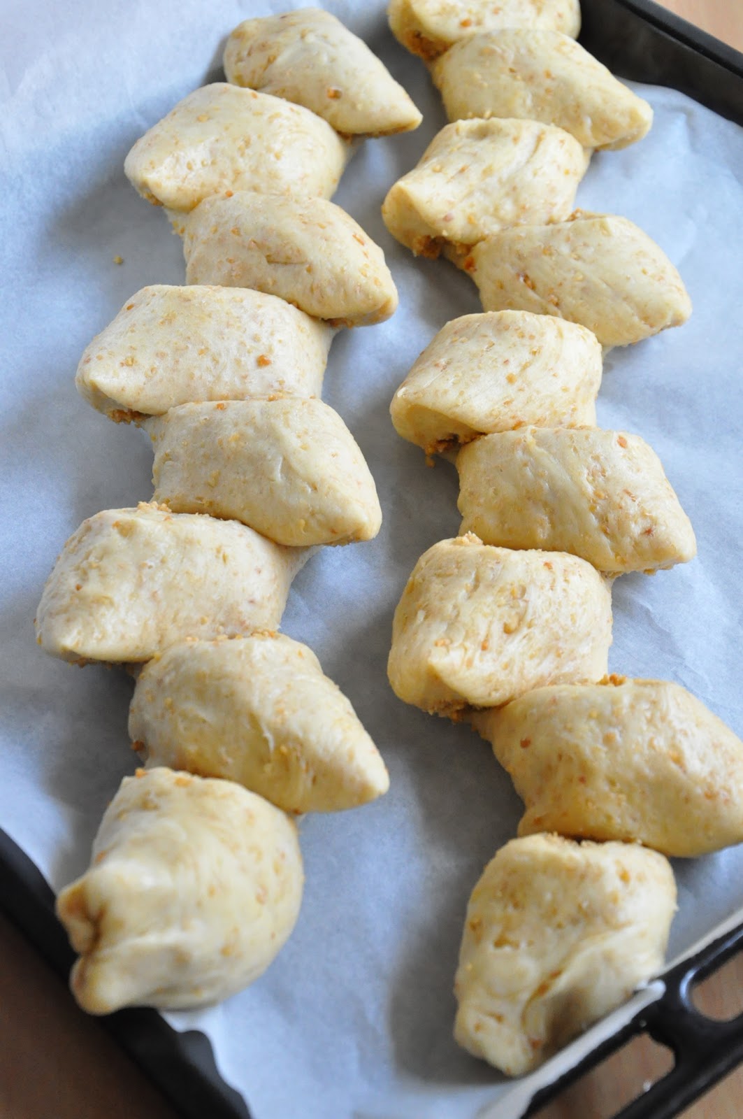 Po vykysnutí z cesta urobíme šúlok, ktorý jemne roztlačíme. Natrieme naň zmes arašidov a masla. Prstami spojíme obe strany. Šúlok prevrátime spojenou stranou dolu a prenesieme na plech. Nožnicami nastrihneme cesto asi vo vzdialenosti 5 cm od začiatku. Nastihnutú časť otočíme smerom doprava. Opäť nastrihneme v tej istej vzdialenosti od prvého strihu a otočíme smerom doľava. Toto opakujeme na celom ceste.