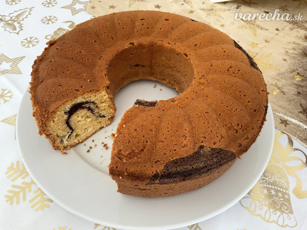 Polovicu hmoty vylejeme do vymastenej a hrubou múkou vysypanej formy na bábovku. Do druhej polovice pridáme kakao a nalejeme na vrch. Pečieme v predhriatej rúre.