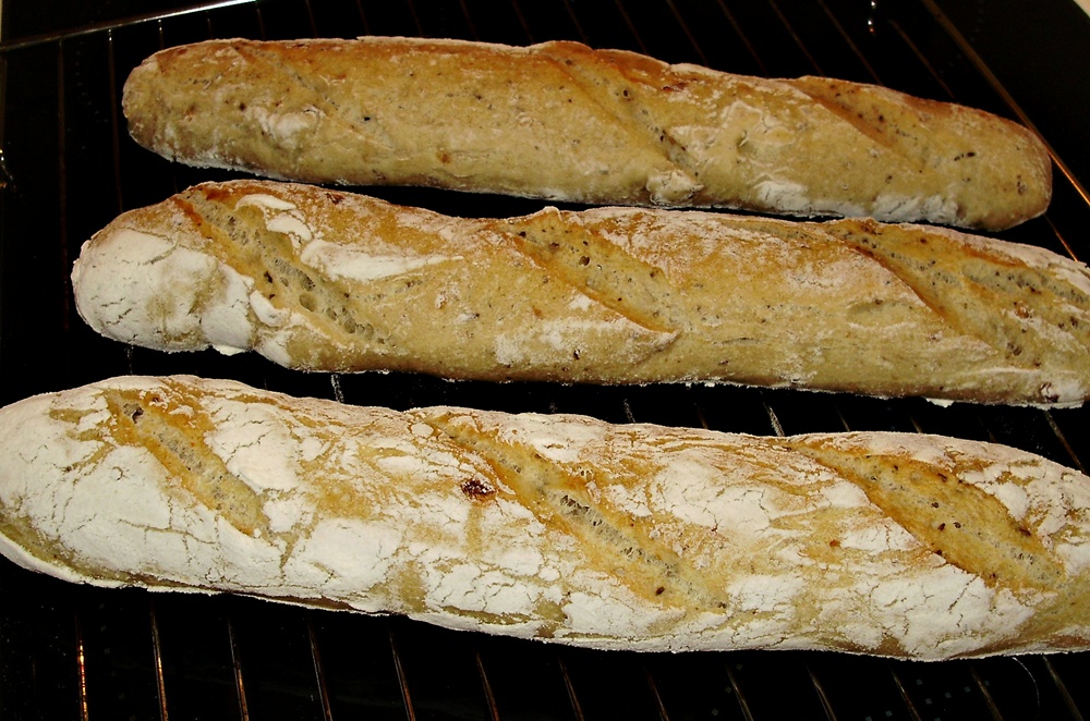 Ruru si vyhrejeme na 220 st aj s plechom.Potom bagety preneste aj s papierom na ten horuci plech.Ked ich tam šupnete,vhodte na spodok rury par kociek ladu ,teplotu znížte na 190-200 st.A pečieme asi 20-25 minut do chrumkava.Nechame vychladnut na mriežke.
