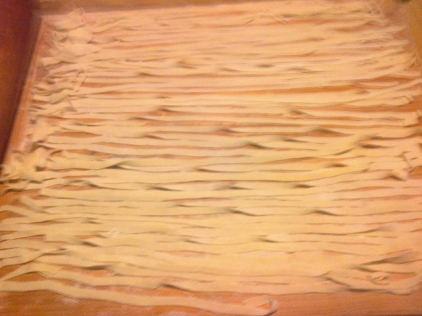 cesto som poriadne vymiesila a potom rozvaľkala na veľkosť pracovnej dosky..snažím sa vyvaľkať, pokiaľ sa dá, obdĺžnik, aby boli rezance rovnako dlhé...