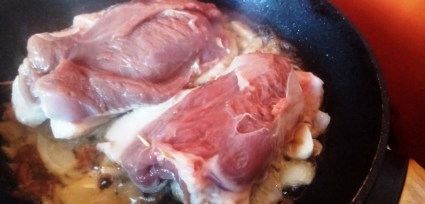 Potom som mäso osolila, okorenila, posypala rascou, kurkumou, mletou červenou paprikou a podliala vývarom z kačacích drobkov.