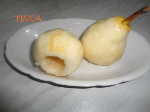 Zdravé stredne tvrdé hrušky jemne ošúpeme,pričom stopku ponecháme. Na druhej strane skrojíme,aby nám pri servírovaní pekne stáli. Opatrne vyberieme jadrovník.