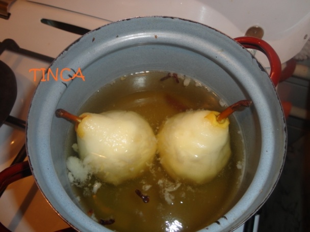 Nastojato ich uložíme do vyššej nádoby, pocukrujeme, zalejeme vínom, do ktorého pridáme kúsok škorice a klinčeky. Varíme na miernom ohni podľa zrelosti hrušiek 8-15 minút. Pozor na prevarenie, lebo potom by nám pri servírovaní pekne nestáli. Ja som mala zrelšie,tak som varila 8 minút. Vyberieme, necháme vychladnúť a stiecť na servítke.