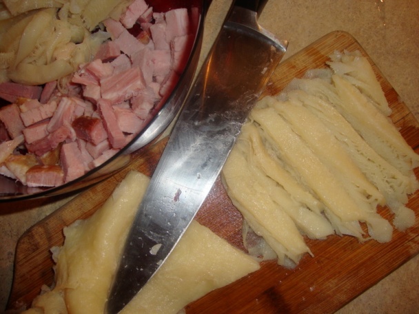 medzitým pokrájame ochladené držky na široké „rezance“ a údené bravčové na úhľadné hranolčeky,