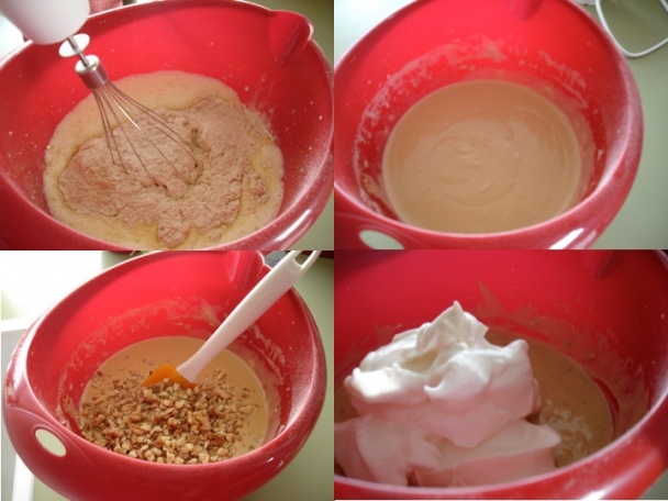 K vyšľahanej zmesy pridáme múku s Master-Mixom a PDP. Prešľaháme. Pridáme sekané oriešky a z bielkov ušľahaný tuhý sneh. Opatrne premiešame.