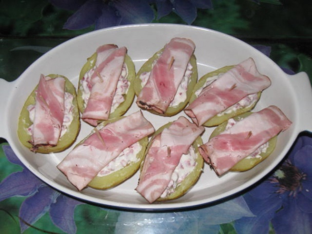 Navrch uložíme zrolovaný plátok slaniny, prepichneme ho špáradlom.